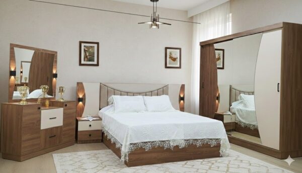 - مزودة بإنارة جانبية على الكومودينو والتسريحة ومزودة بشريط إنارة ليد على ظهر السرير ، ومزودة بمرايا قص ليزر وحرف شامبرليه